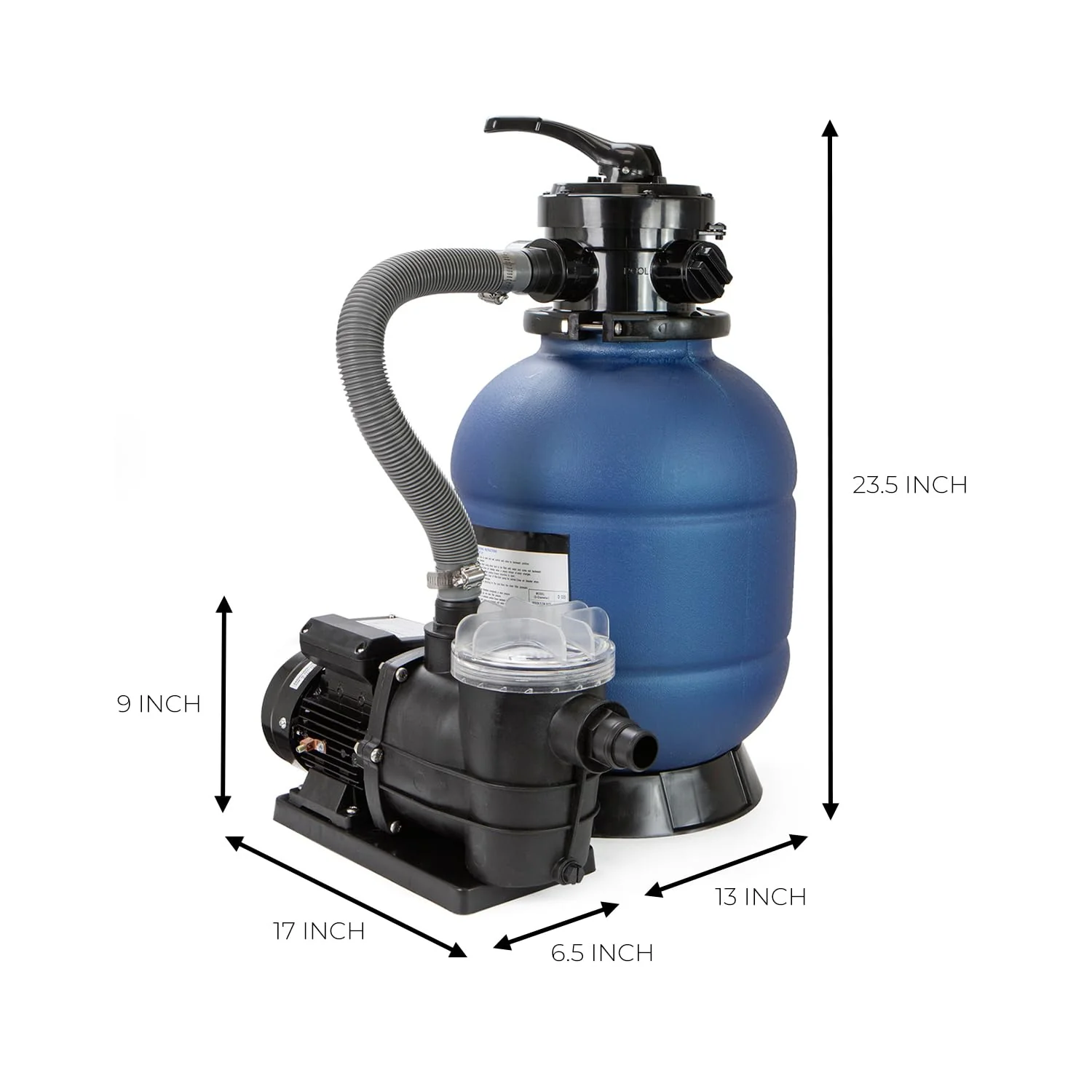 - Sizable Capacity - This sand filter pump is housed in a one-piece 13-inch tank with a capacity of 42 pounds of sand that can filter above ground pools up to 10,000 gallons