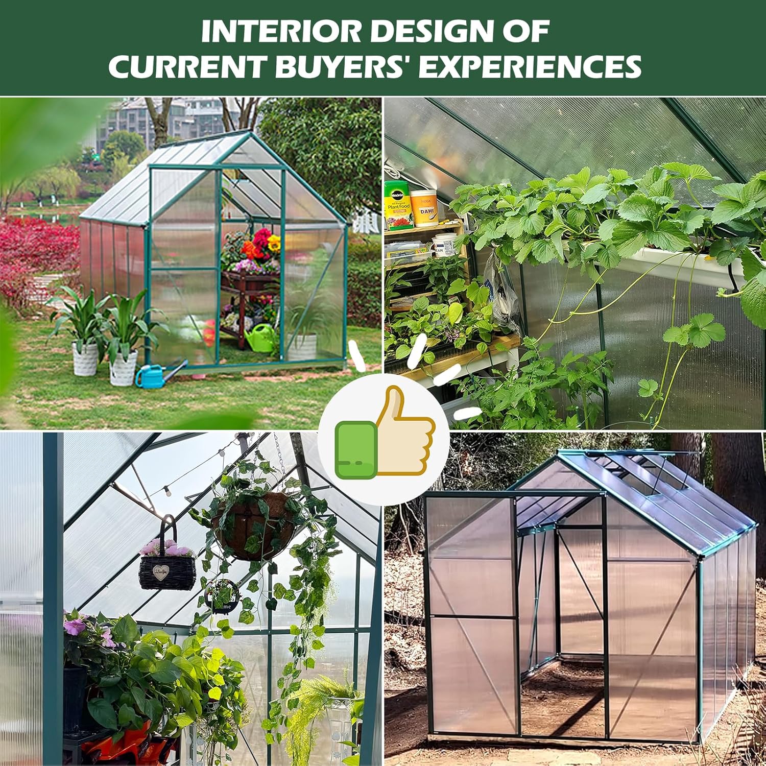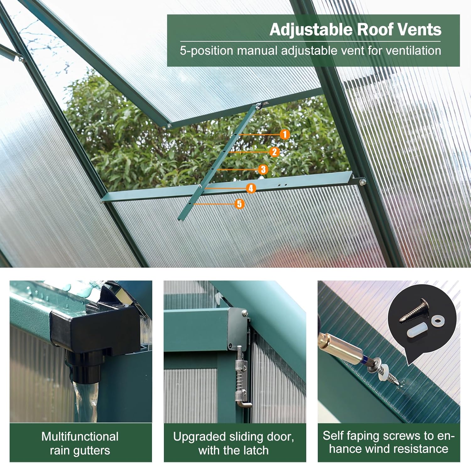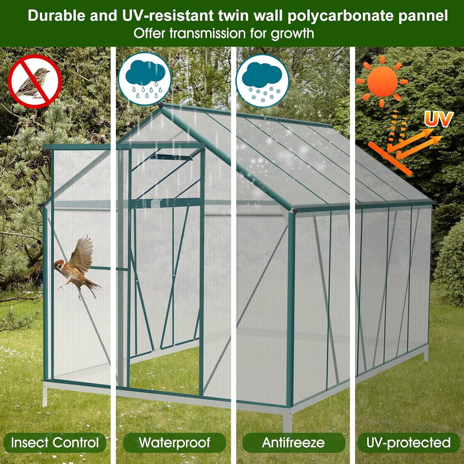 • 6'x10' Walk-in Greenhouse with 4mm 800G Polycarbonate Panels - Heavy-Duty Aluminum Frame, Wind/Snow Resistant for Gardening, Includes Sliding Door & Ventilation Windows (Green)