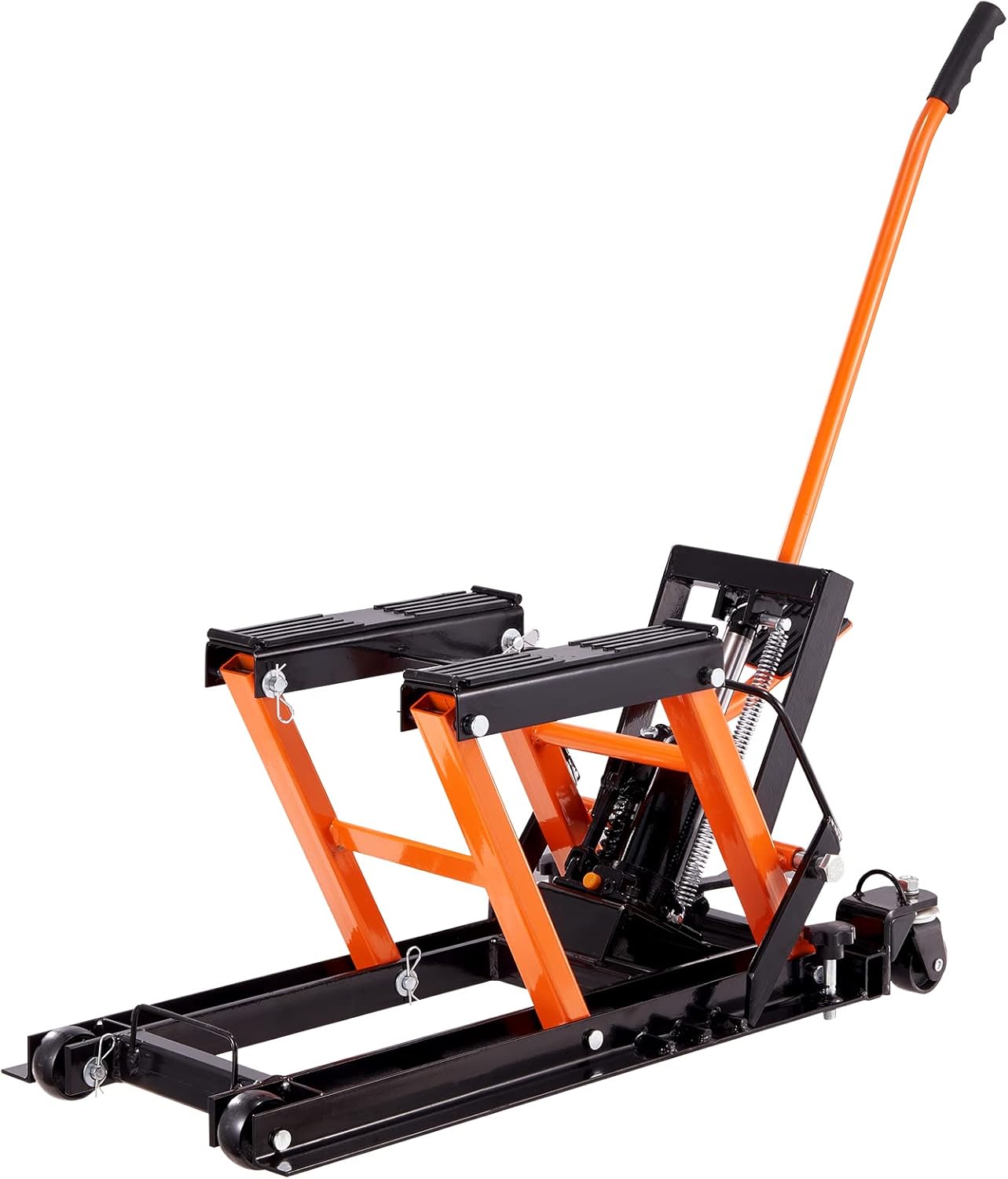 • High-quality Steel Material: Made of high-strength solid steel structure and coated with a bright powder coating, this motorcycle jack is rust, corrosion, and grease-resistant, ensuring a long-term use. Neatly store it in your garage or repair shop for easy access. Get your hydraulic motorcycle jack today and make motorcycle maintenance a breeze!